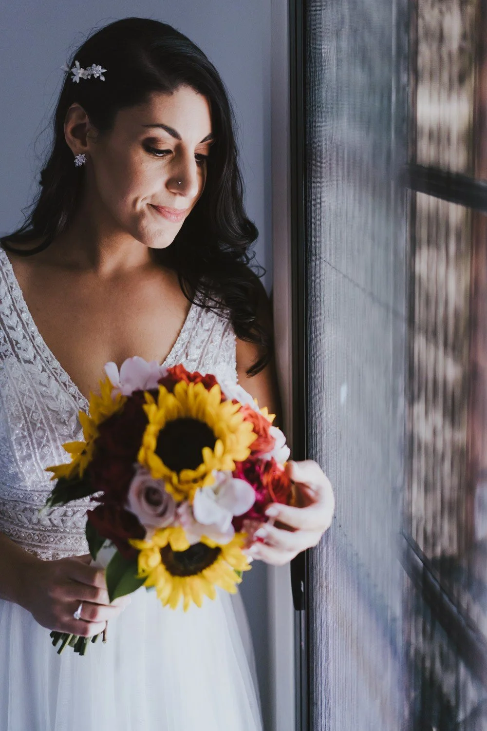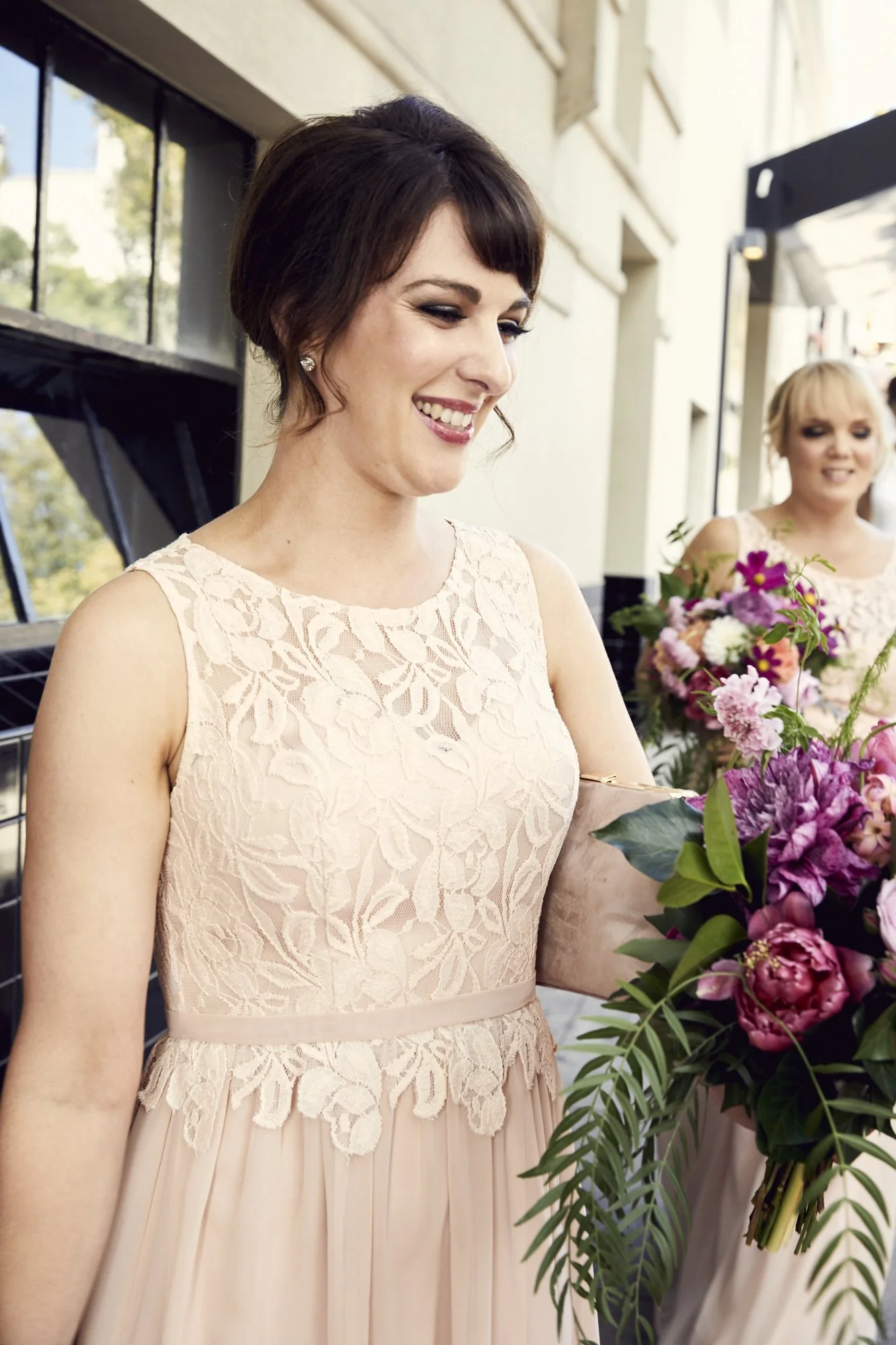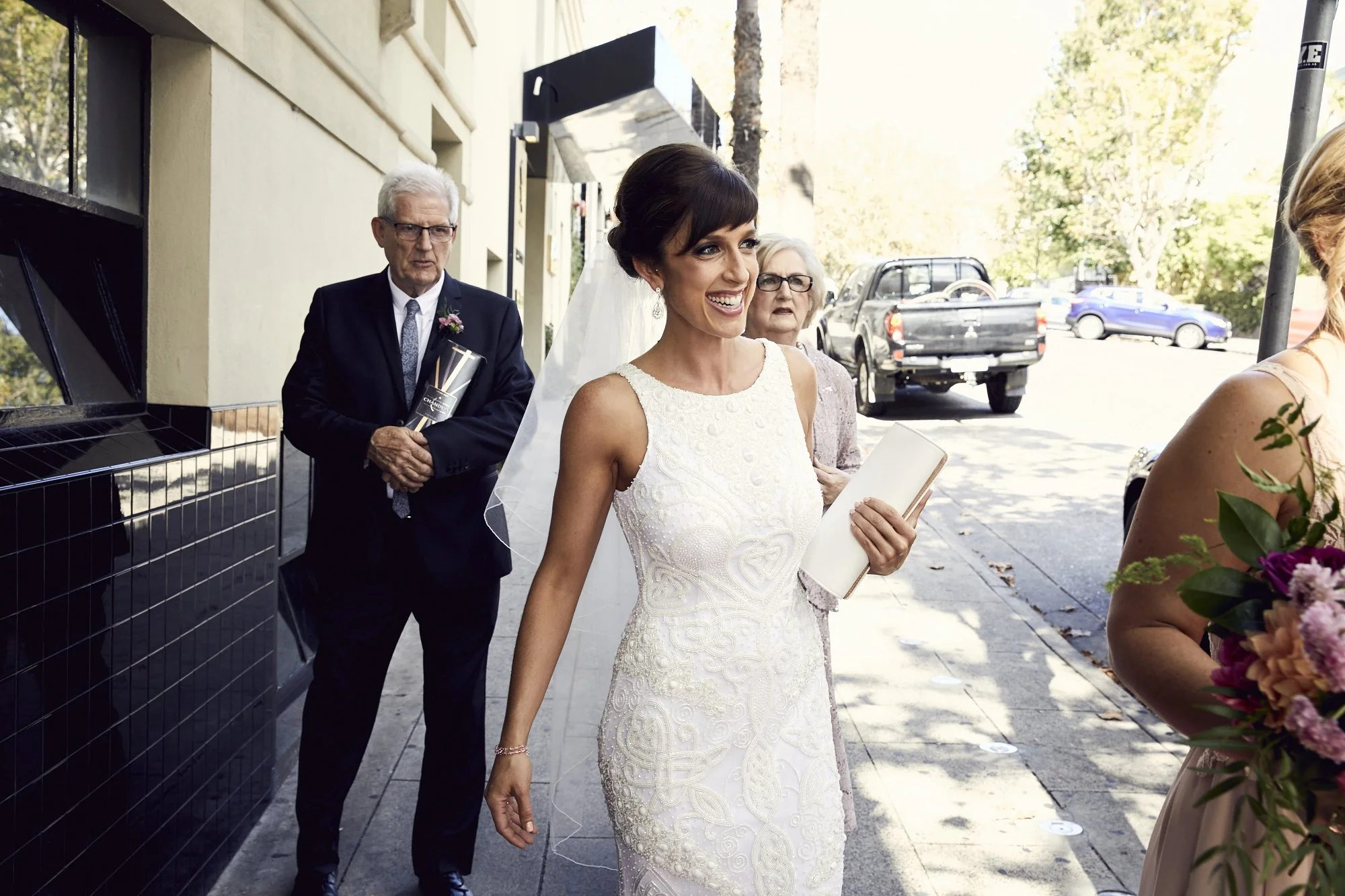 A beautiful Bride on her wedding day, sitting in the back seat of the car smiling and holding a big bunch of flowers
