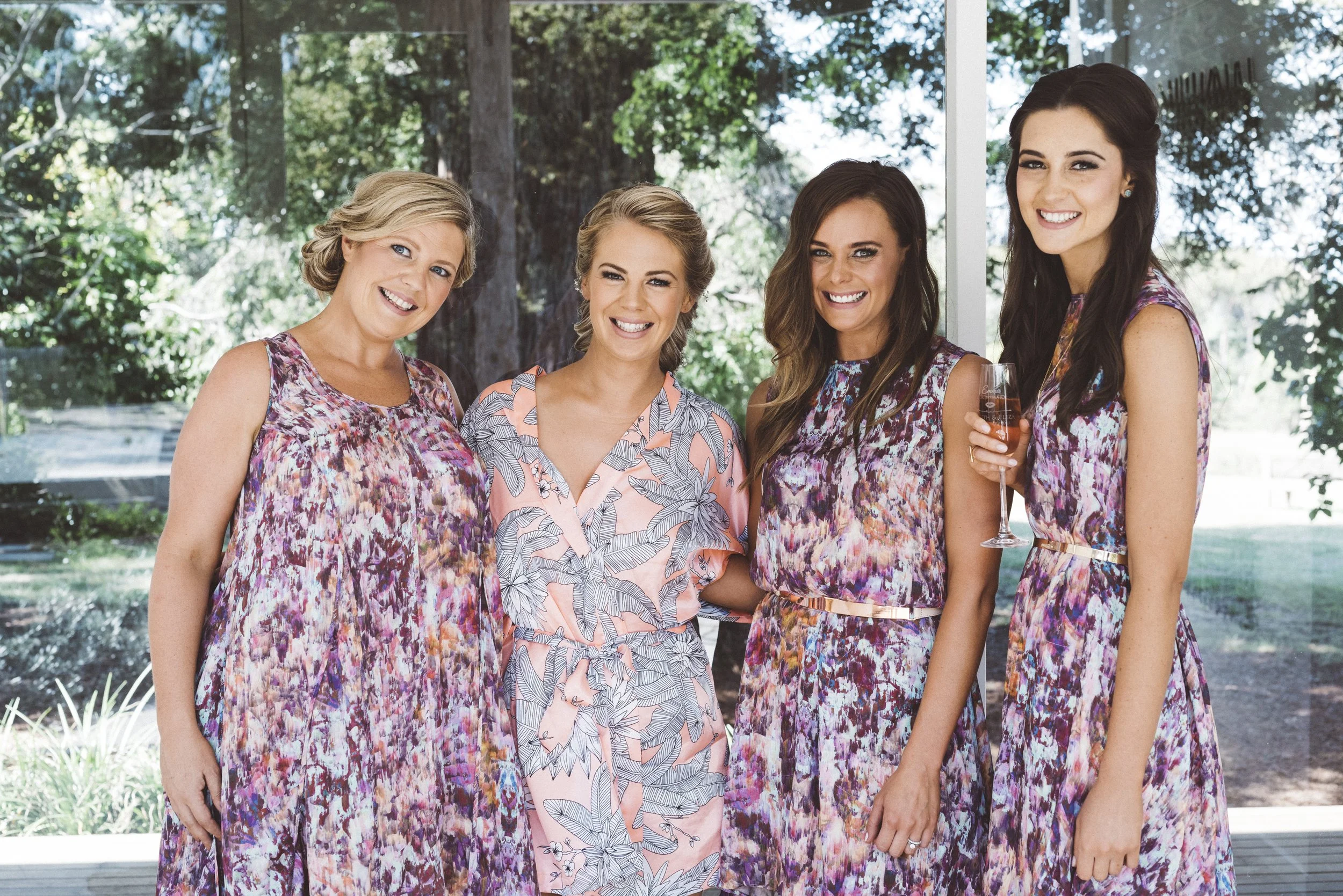 A beautiful Bride standing with her Bridesmaids on her wedding day. They have gorgeous soft glam makeup.