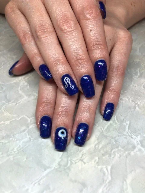 The middle fingers are painted white with a blue evil eye symbol in the centre.